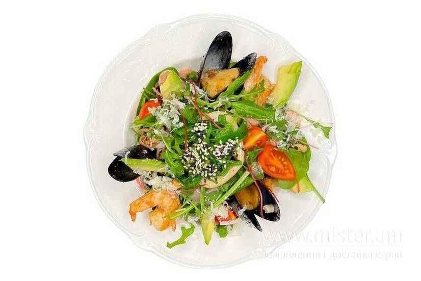 Мікс морепродуктів (бейбі восьминіг, креветки, кальмар, м`ясо мідій та мідії в мушлі),авакадо, чука, кунжут, пармезан рукола, шпинат, томати чері, соус гренадиновий.