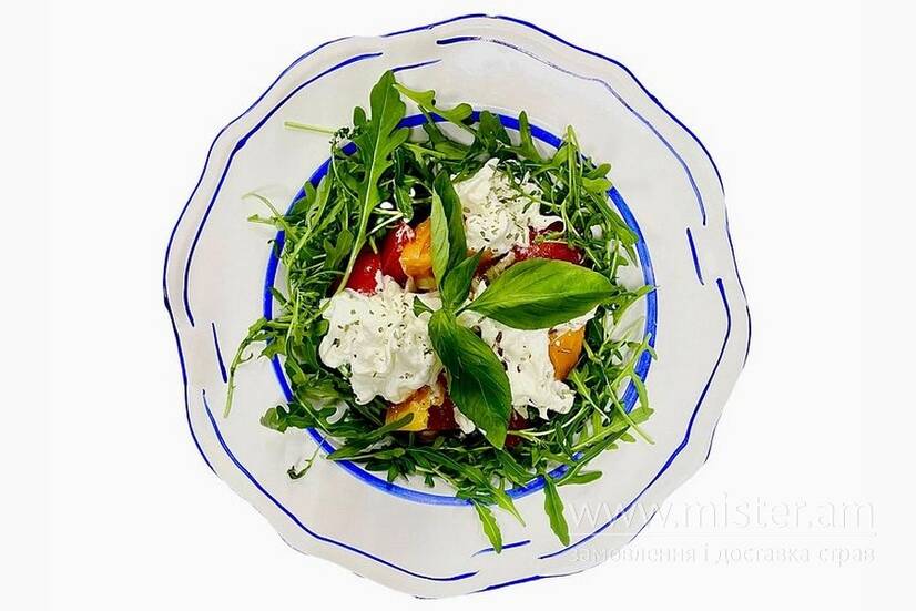 Салат зі запашною рукколою,свіжими томатами, каперсами, селерою і найголовнішим інгредієнтом - ніжним сиром страчаттела.