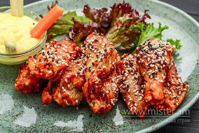 Крила в соусі BBQ, соус сирний, морква, стебло селери.