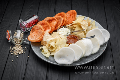 Рисові чіпси, рисові чіпси гострі, чіпси грибні, чіпси з часником, соус тар-тар, соус мексиканець.