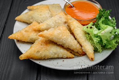 Трикутники з тіста філо з мідіями, куркою, морквою, та ананасовим соусом.