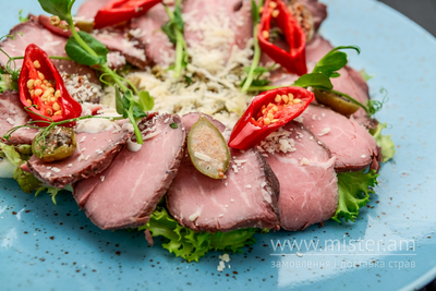 Яловичий ростбіф, мікс салатів, гірчичний соус, консервований тунець, каперси, пармезан, перець пепероні.
