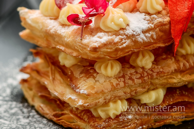 Листове тісто, мариновані персики, лимонно-шоколадний крем.