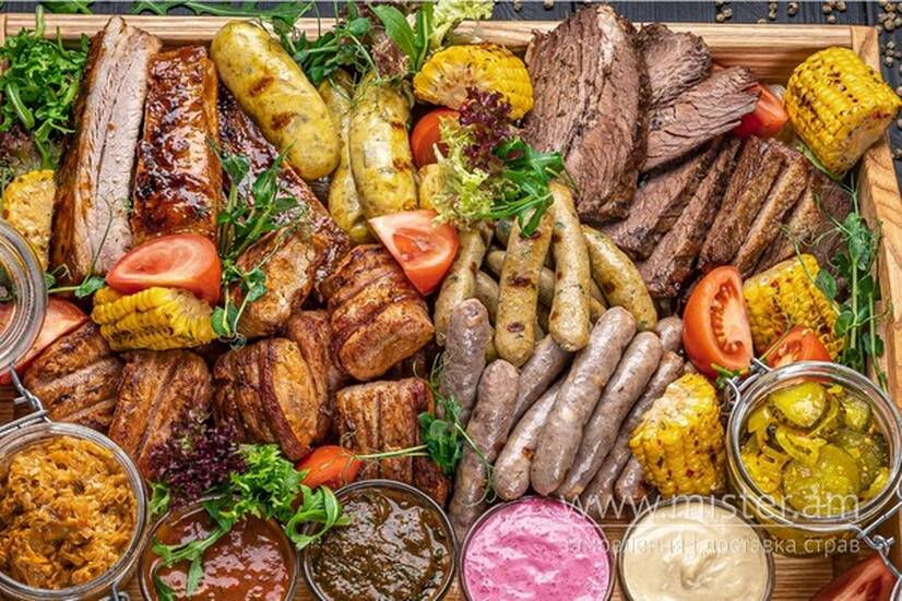 Свинні ребра в гранатовій глазурі, яловичина бріскет, свинна вирізка в беконі, ковбаски курячі з беконом і грибами, ковбаски баварські карі, ковбаски баварські з сиром, тушена капуста, мариновані огірки пікулі, томати, кукурудза на грилі, соуси: аргентинський, каре, з хріну, гірчичний.