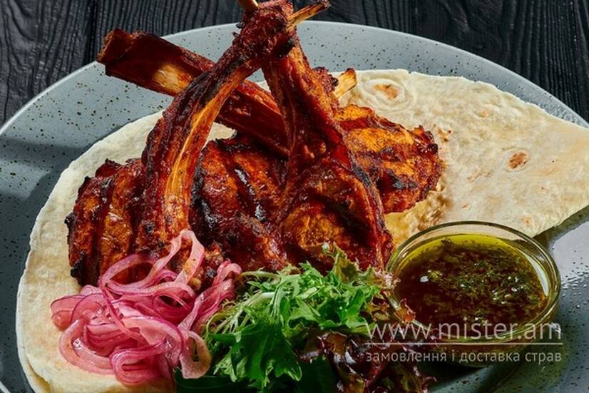 Каре телятини, тортилья, маринована цибуля, соус чимі мурі, мікс салатів.