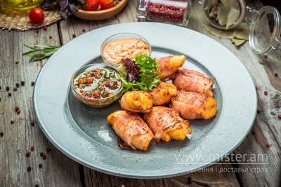 Куряча грудка в беконі, соус пепер, соус каре, мікс салатів. Вагова страва.
