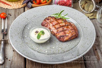 Найсоковитіший шмат реберної частини яловичини, соус Песто. Вагова страва. Ступінь прожарки на вибір.