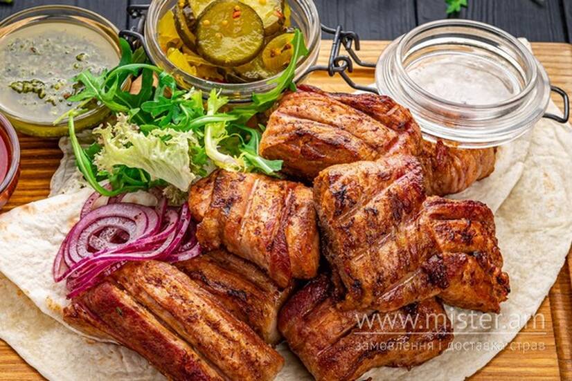 Свинна вирізка в беконі, мариновані пікулі, соус чімі чурі, соус гранатово-томатний, тортилья, маринована цибуля.
