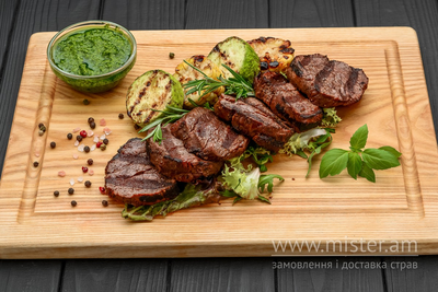 Стейк філе міньйон, качан кукурудзи, кабачок, мікс салатів, соус сальса верде.