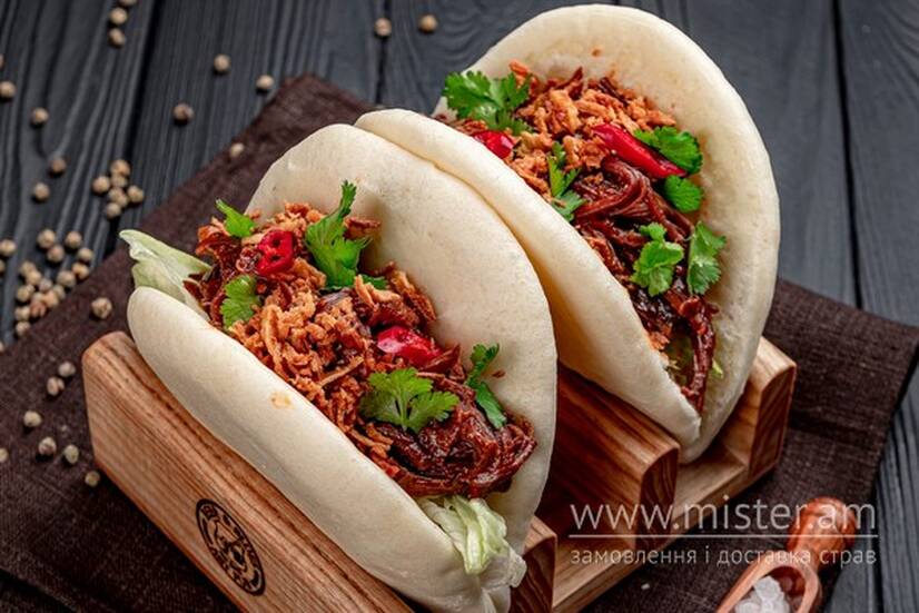 Парові булочки бао, яловичина бріскет з кисло-солодким соусом, гострий соус, кінза, цибулевий кранч, перець чилі, салат айсберг.