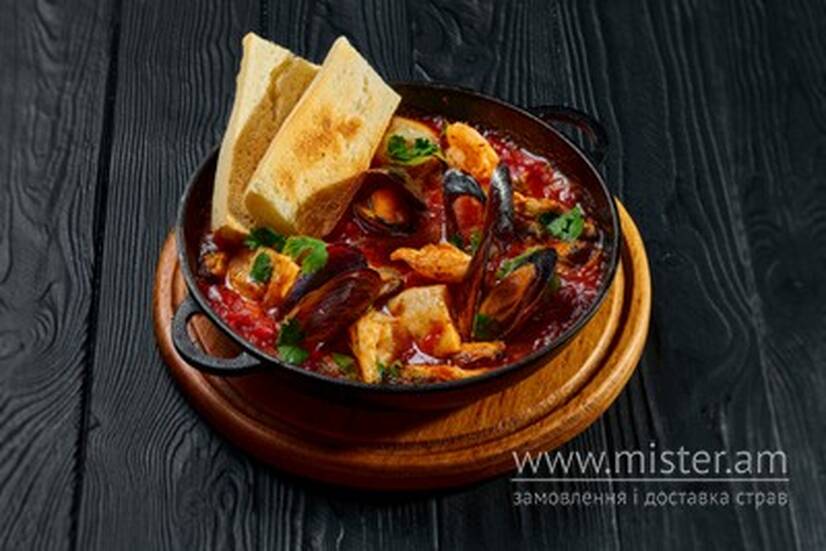 Креветки тигрові, мідії в мушлях, м'ясо мідій, рибний бульйон, окунь морський, томатний соус з цибулею перцем та чабрецем, часник, кінза, обсмажений багет.