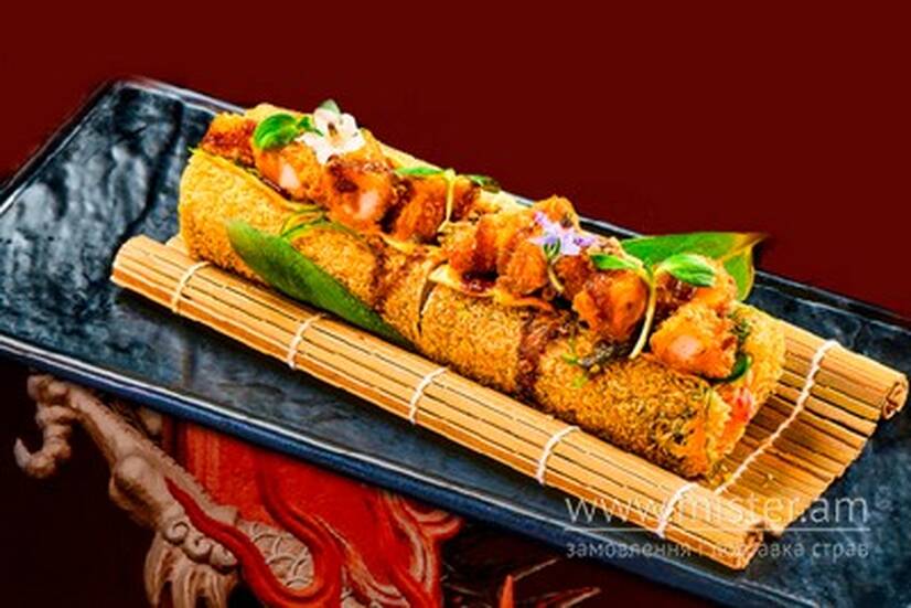 Рис, норі, Філадельфія, кляр темпура, сухарі панко, сирна паста з ікрою тобіко, сир чедер, креветка в темпурі та сухарях, чука, соус унагі, соус манго, соєвий соус, цибулевий кранч, мікро зелень.