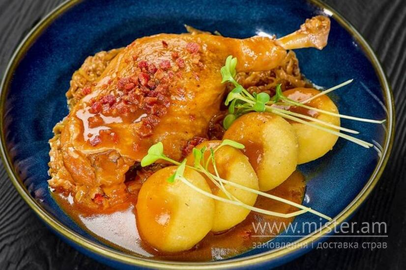Томлена качина ніжка, кнедлі картопляні, тушкована капуста з копченостями, соус овочево-м`ясний, кранч з бекону, мікрозелень.