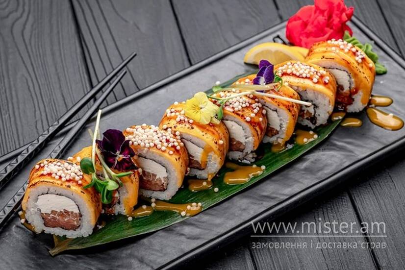 Рис, норі, манго, сир чеддер, філе лосося, Філадельфія, соус унагі, соус манго, дутий рис, мікрогрін.