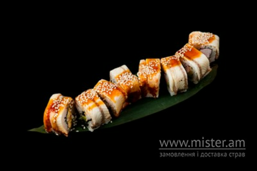 Норі, рис, вугор, тобіко, кунжут, авокадо, креветка коктельна, соус унагі.
