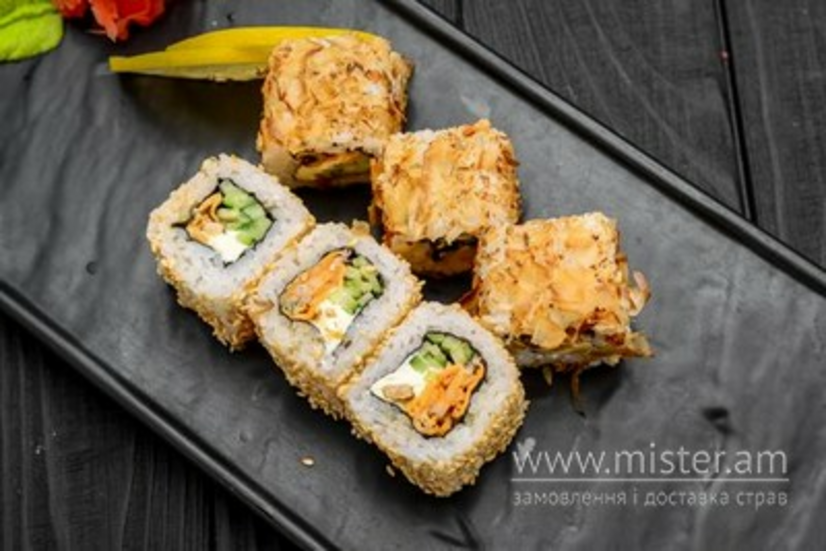 Норі, рис, мідія, соус спайсі, огірок, тунцева стружка, кунжут, сир Філадельфія.