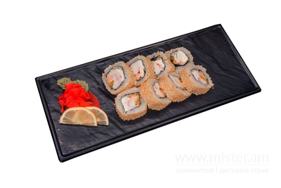 Рис, норі, крабова паличка сурімі, сир Філадельфія, салат айсберг, маринований дайкон, кунжут, креветка коктейльна.