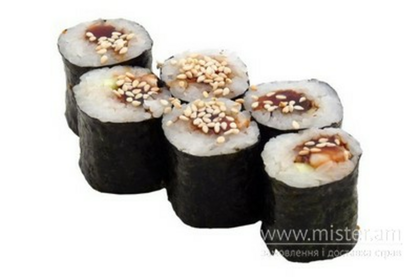 Норі, рис, вугор, огірок, кунжут, соус унагі.