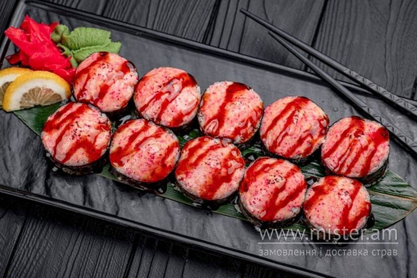 Рис, норі, сир гауда, соус спайсі, ікра тобіко, грильований окунь в соусі унагі, сурімі, огірок, соуі унагі.