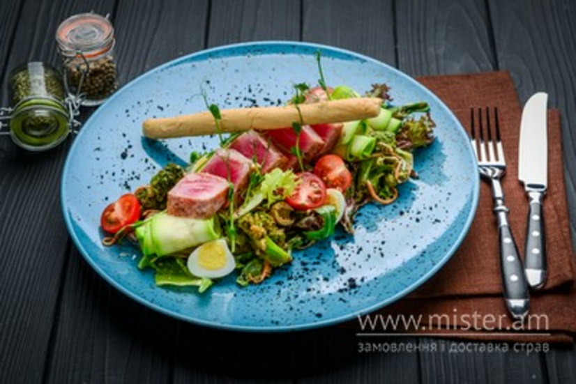 Філе тунця, морква, броколі, оливки, мікс салатів, соус гірчичний вінегрет, яйце перепелине, помідор чері, цукіні, грісіні, кунжут.