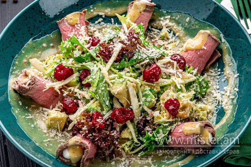Мікс салатів, корінь селери, авокадо, соус айолі, пармезан, мариновані вишні, телятина сувід, сир Філадельфія, заправка грецька.