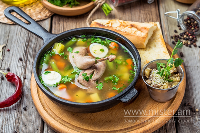 Курячий бульйон, куряче філе, міні паста, картопля, зелень, тости, яйце перепелине, грибний дюксель.