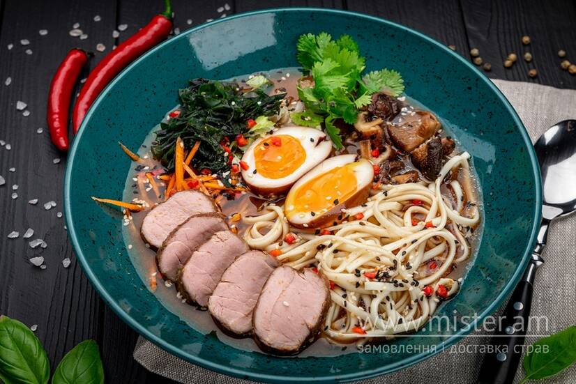 Свинна вирізка, морква, пекінська капуста, шийтакі, вакаме, норі, локшина пшенична, яйце куряче, перець чилі, кунжут.