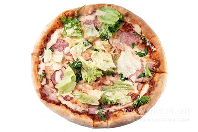 Домашній томатний соус, бекон, куряче філе, мікс-салат, сири пармезан, моцарела та соус Цезаре.