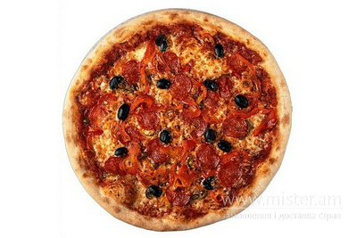 Домашній томатний соус, салямі піканте, перці болгарський і чілі, маслини та моцарела.
