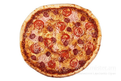 Домашній томатний соус, шинка, салямі, помідори, маринована цибуля та моцарела.