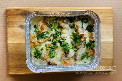 Картопля, зелень, куряче філе, печериці смажені з цибулею, соус Бешамель, вершки, сир моцарела.