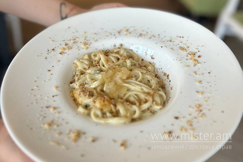 Паста тальятелі, вершковий соус, сир радомер, сир горгонзола, сир пармезан, горіхи волоські, карамелізована груша.