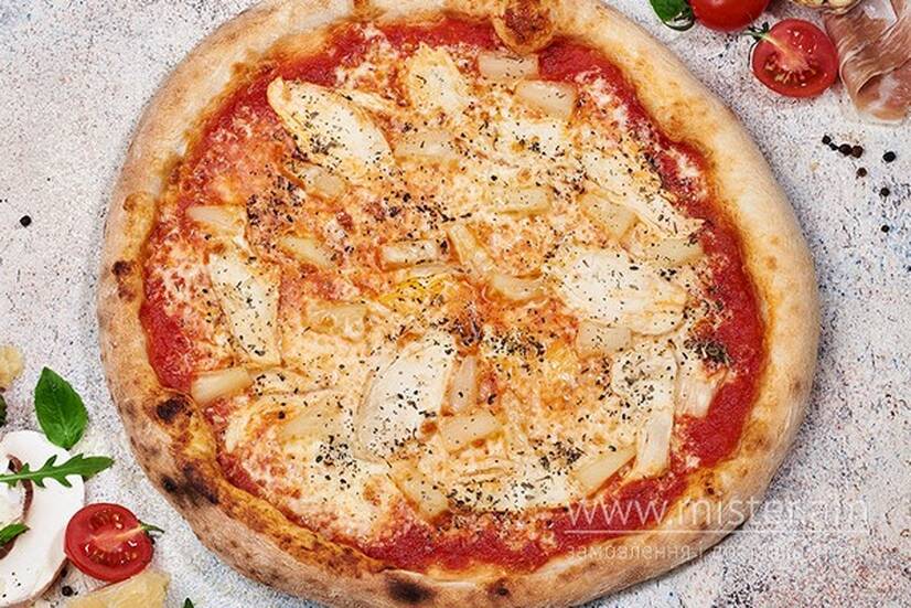 Вершковий соус, моцарела, горгондзола, груша, цибуля карамелізована, соус бальзімічний, рукола.