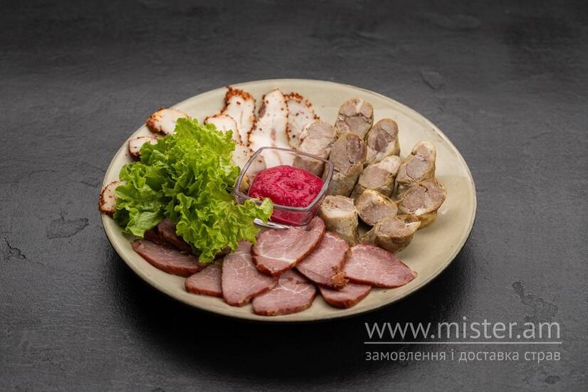 Сало мариноване, ковбаса домашня, індичка запечена, хрін, зелень.