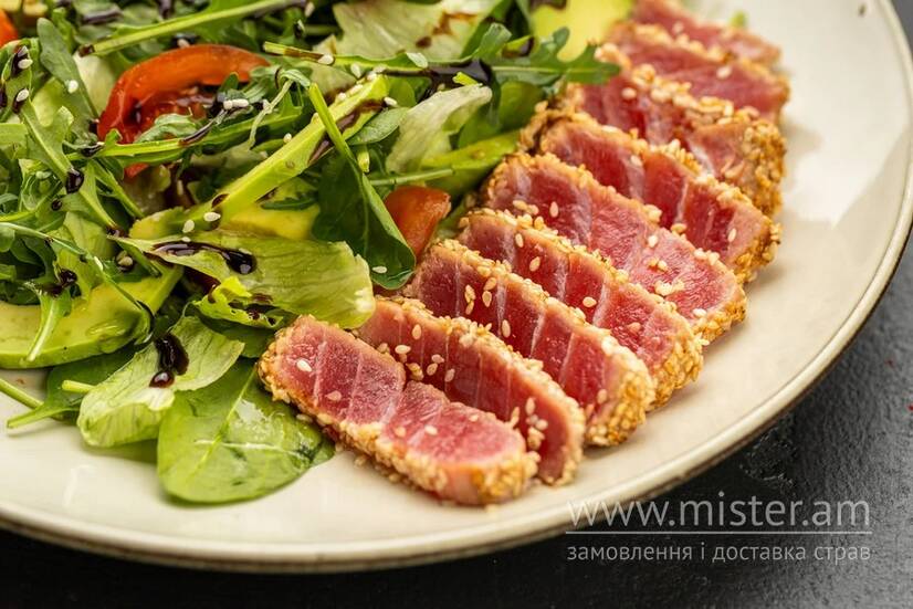 Тунець, мікс салату, авокадо, чері, кунжут, олія оливкова.