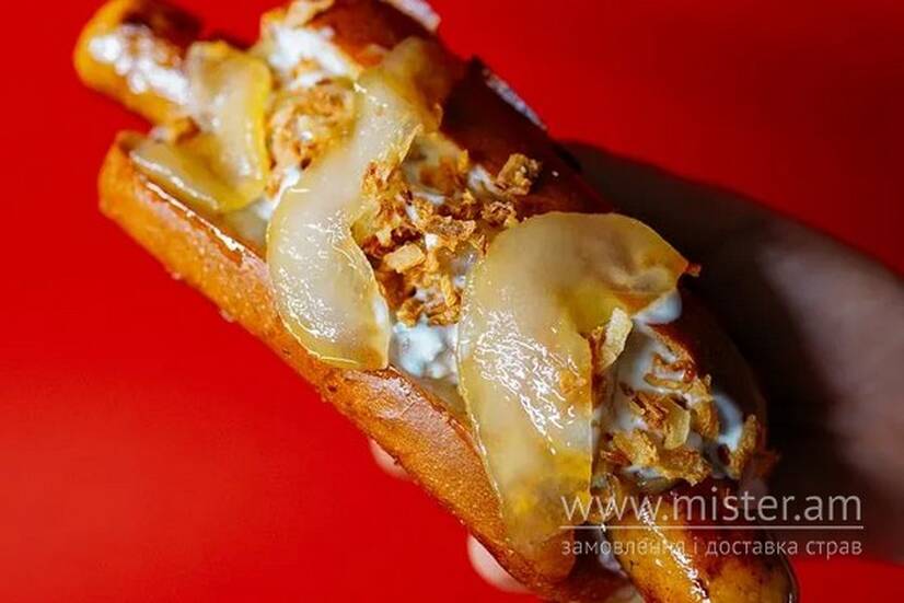 Підсмажена булочка бріош, куряча сосиска, соус айолі, соус блю-чіз, карамелізована груша, цибулевий кранч. Подаємо з картплею фрі.