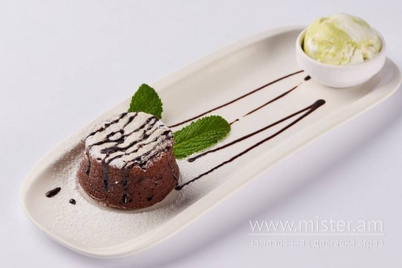 Шоколадне тістечко, подаємо з фісташковим морозивом.