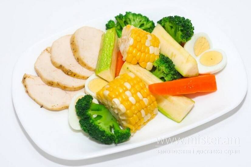Запечене куряче філе, перепелині яйця,мікс відварених овочів: броколі, солодка кукурудза, морква та кабачок.