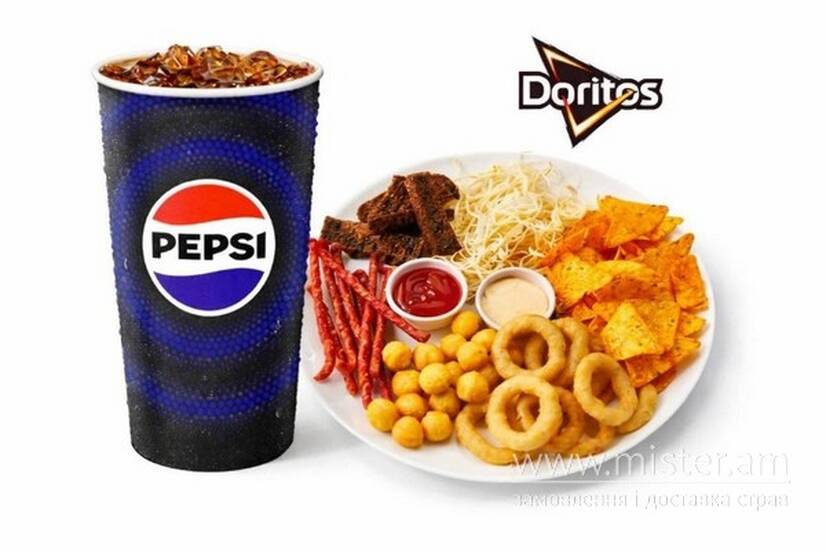 Кукурудзяні чіпси Doritos, кабаноси цибулеві кільця, сир копчений, грінки, картопляні кульки, соус часниковий, кетчуп, пепсі пляшка 0,5 л.