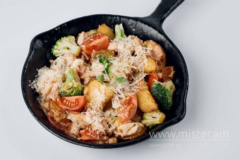Картопля, бедро куряче, брокколі, томати Черрі, вершки, пармезан.