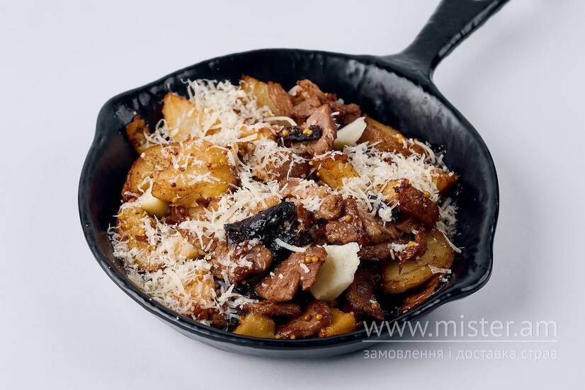 Картопля, свинина, чорнослив, яблуко, гірчиця, пармезан.
