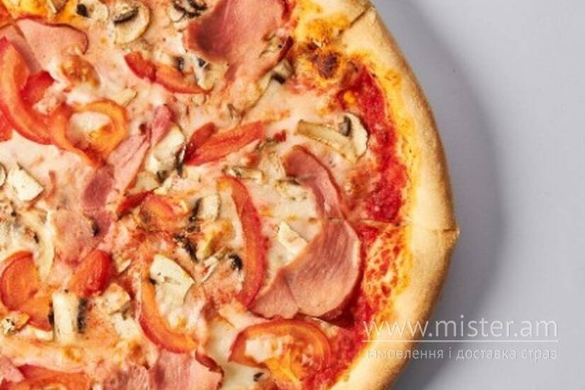 На помідоровому соусі, шинка, печериці, помідори, сир моцарела.