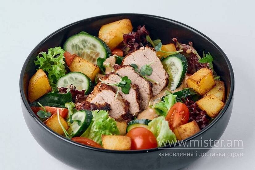 Вирізка свинна, мікс салату, огірок, картопля, помідори черрі, соус стейк.