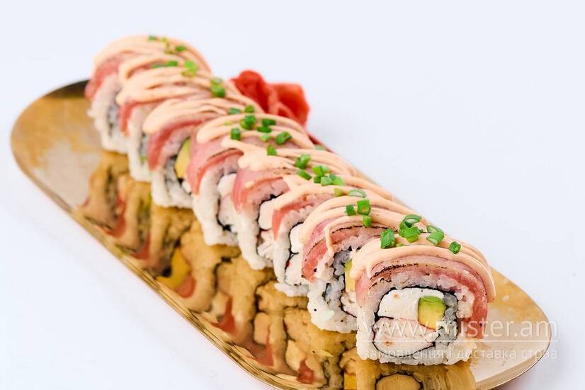 Тунець, сир Філадельфія, авокадо, соус спайс, сурімі, цибуля зелена.