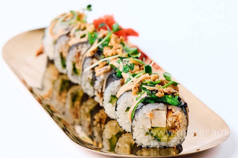 Вугор, сир тофу, огірок свіжий, чука, соус горіховий, соус унагі, соус териякі, цибуля сушена.