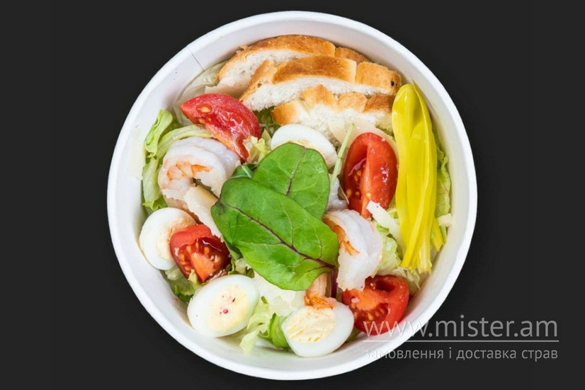 Креветки, яйця перепелині, пармезан, черрі, айсберг, чіабатта, соус цезар.