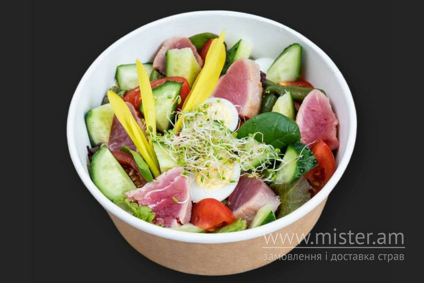 Тунець, огірок, помідор, салат Лола, олія оливкова, яйця перепелині, спаржа, рукола. Вітамінний і мінеральний склад салату нісуаз багатий і різноманітний. Перш за все, це вітаміни групи B1, B2, D6, а також вітаміни A, E, H, PP. Кальцій, магній, натрій, фосфор і абсолютно все амінокислоти містить цей салат. Тунець часто їдять люди, які дотримуються дієти, адже калорійність у даній риби невелика, а жири, які вона містить - «правильні», а завдяки Омега-3 цю рибу рекомендують їсти для профілактики онкозахворювань.