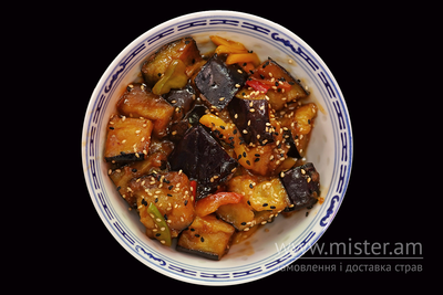 Баклажани, солодкий перець, кисло-солодкий соус власного виробництва.