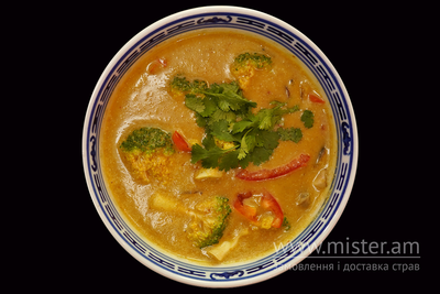 Кокосове молоко, карі паста, цибулька, гриби, броколі або цвітна капуста, солодкий перець, кінза.