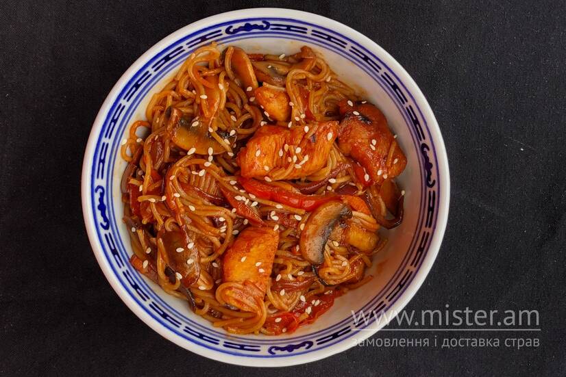 Рисова локшина у гострому соусі кочхуджан, з куркою, солодким перцем, морквою, цибулькою, грибами, часничком та імбиром, посипана кунжутом.